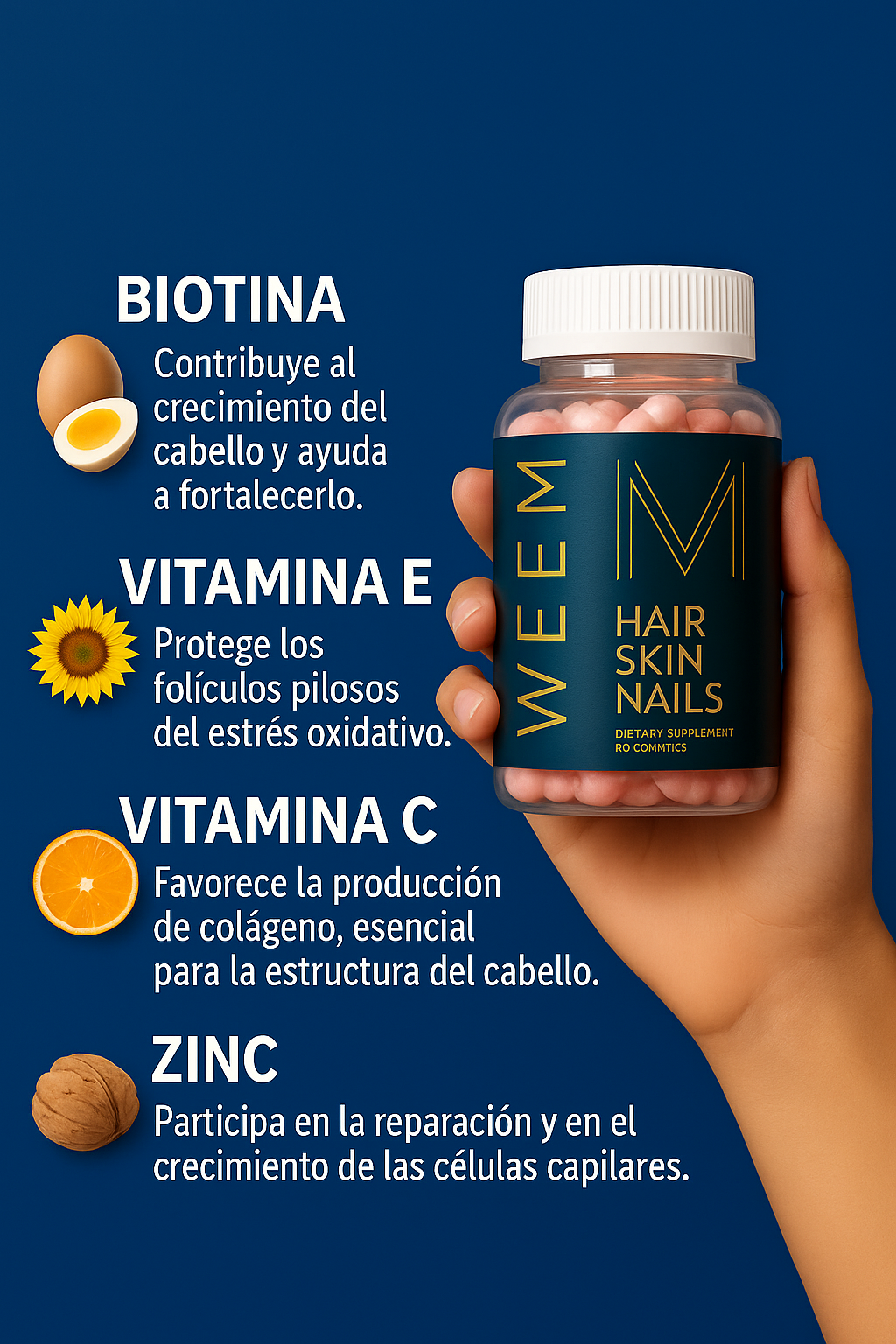 - Biotina (5000 mcg) → estimula el crecimiento y la resistencia del cabello.