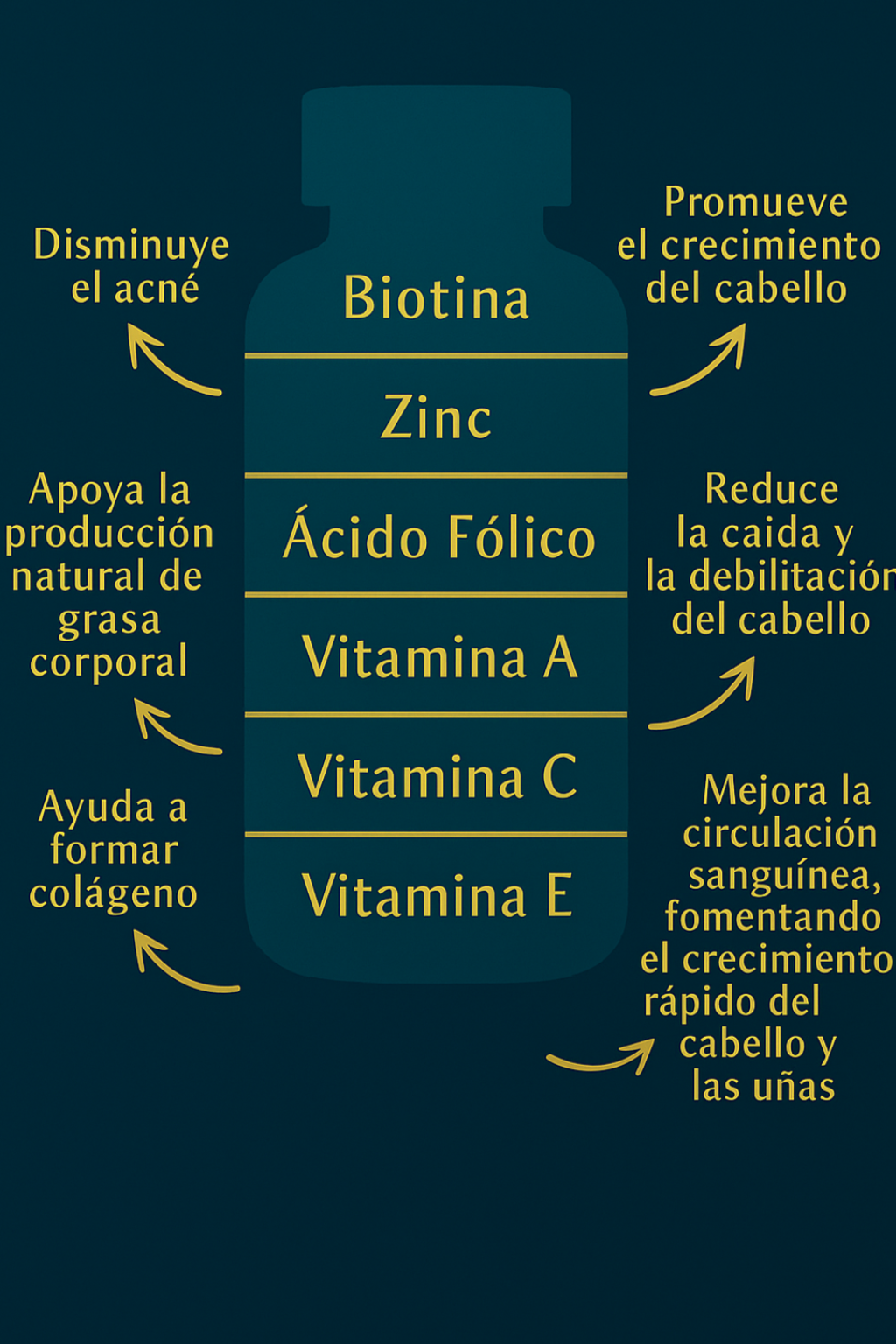 Biotina (5000 mcg) → estimula el crecimiento y la resistencia del cabello.